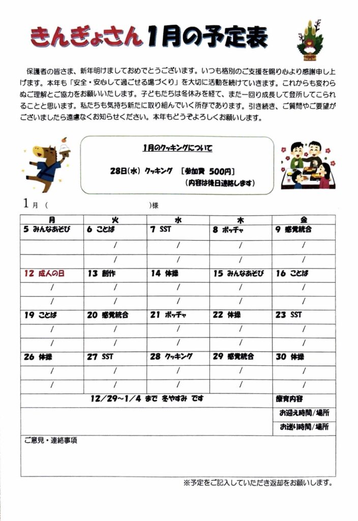1月の予定です
